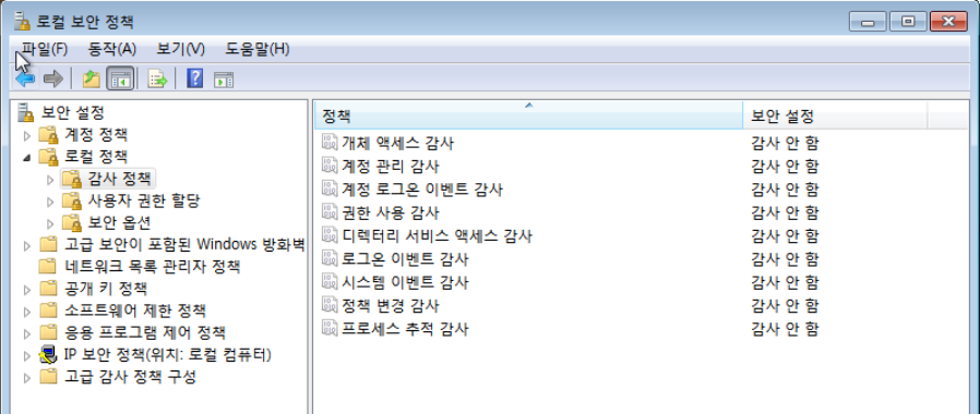 로컬 정책 > 감사정책 > 감사안함으로 되어있음 / 후에는 성공, 실패를 체크표시 후 확인