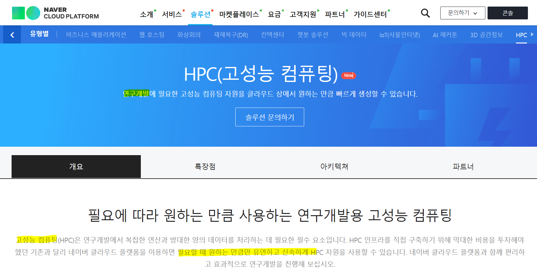=> High Performance Computing (NCP의 전용 HPC인프라 구성 가능, 고객의 인프라로 사용하는 Hybrid 환경도 구축 가능, 금융권 및 증권사에서 많이 사용하는 설루션)