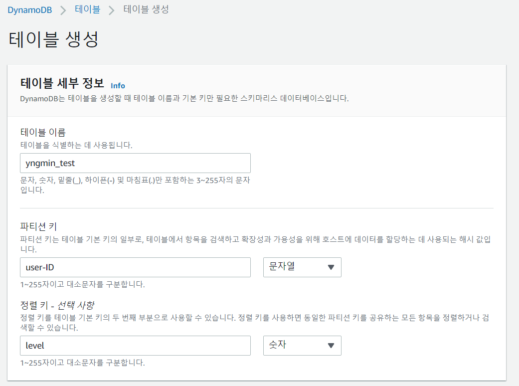 AWS 서비스 > DynamoDB > 테이블 생성