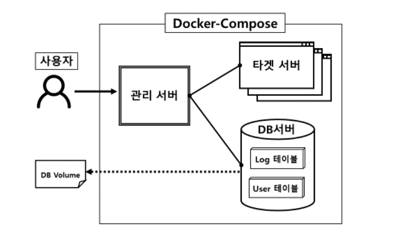 아래 그림과 같이 컨테이너는 총 세개 (‘관리 서버’, ‘DB서버’, ‘타겟 서버’) 그리고 그것을 모두 연결하는 파이썬 프로그램이 핵심이다. 사용자는 관리서버를 통해 타켓 서버에 대한 로그기록을 실기간으로 열람할 수 있다.