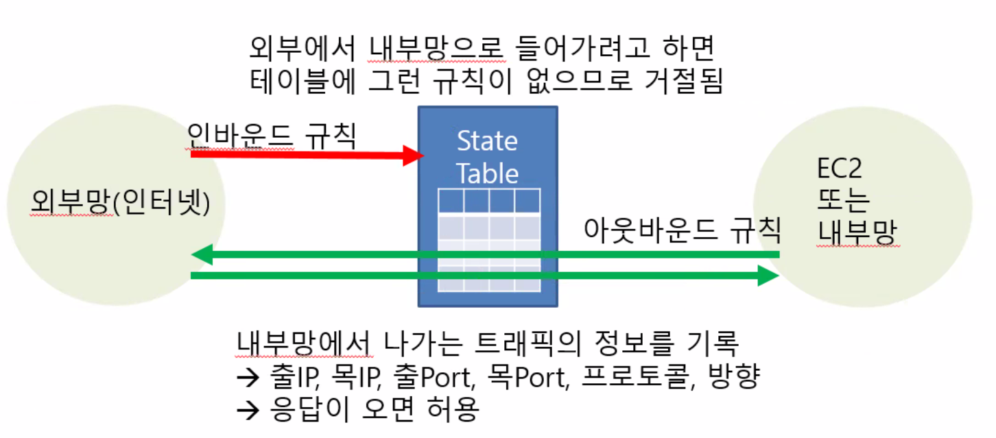 | 동작 원리 | Stateful (리턴 트래픽만 허용) | Staless (리턴 트래픽 고려 안함) |