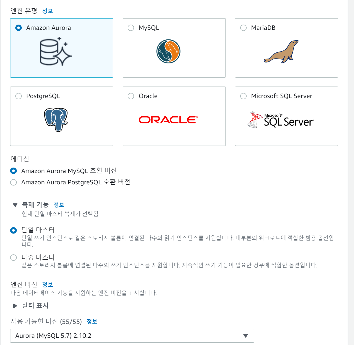 리전 간 정보전달을 위해 꼭 체크해야 할 기능이 '글로벌 데이터베이스 기능'이다. 아래 엔진 버전의 필터를 열어 해당 기능을 활성화시켜준다. 오로라 DB는 별도의 중지나 해당 옵션의 중도변경이 어렵기 때문에 생성시 설정해야 한다.