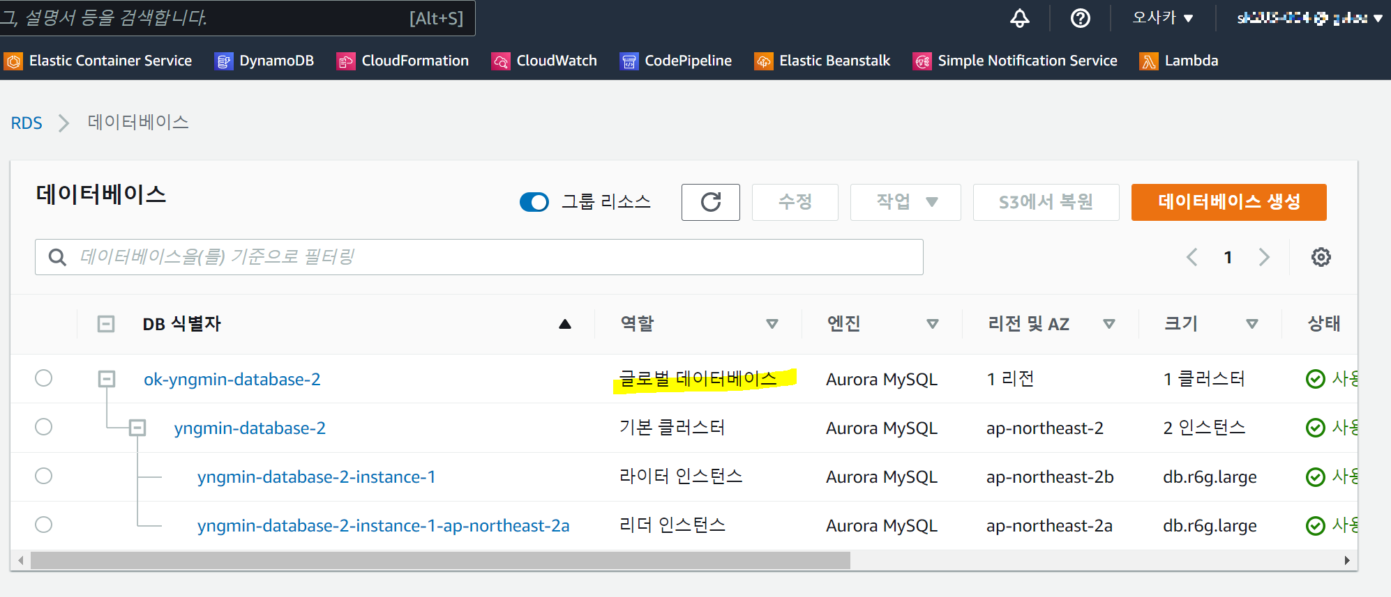 리전 클러스터 선택 > 작업 > 글로벌 데이터베이스 추가