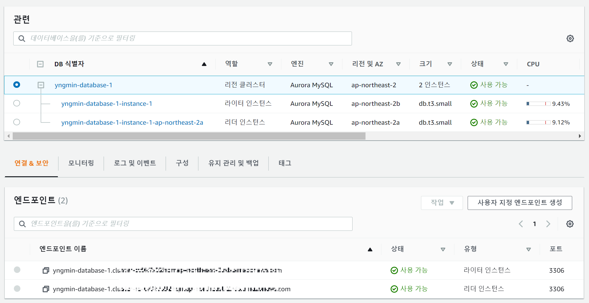 생성된 오로라DB는 아래와 같이 라이터 인스턴스 그리고 리더 인스턴스 총두 개의 엔드포인트를 갖는다. 동리 전의 EC2에서의 접근은 두 엔드포인트 모두 가능하나 라이터는 읽기/쓰기, 리더 인스턴스는 읽기 전용으로 쓰기가 불가하다. 오로라 DB의 기본 세팅은 라이터 인스턴스이다.