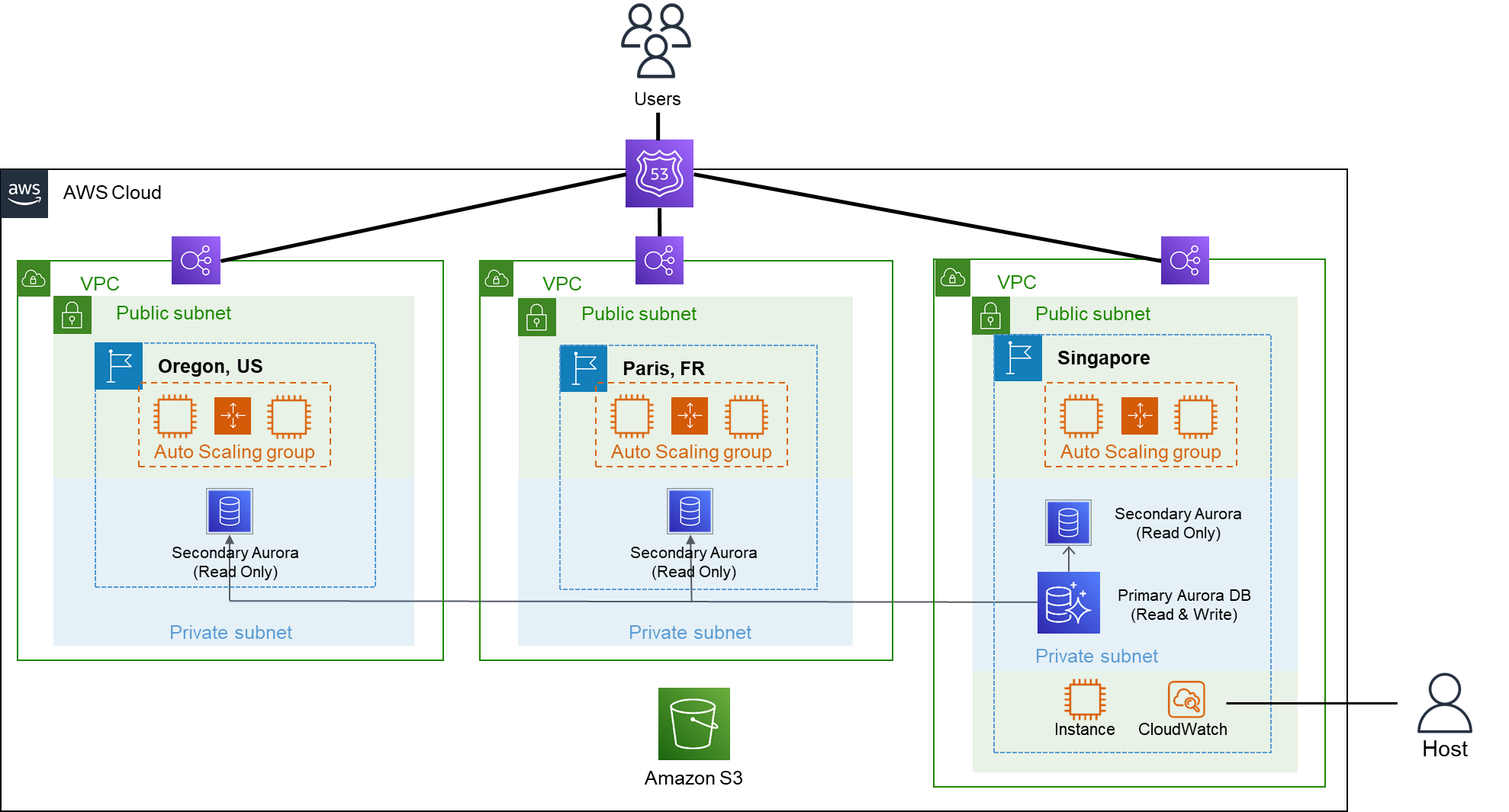 서비스의 중심은 모두 싱가포르 리전에서 시작된다. 오로라DB의 기본 클러스터가 위치해 있으며, 웹서비스를 관리할 Host전용 EC2 또한 싱가포르에 위치한다. 이곳에서 업데이트된 데이터는 오로라 DB의 글로벌 데이터베이스 기능을 통해 다른 보조 인스턴스 DB로 자동 전달되며 각 리전의 인스턴스가 동일하게 지역의 고객들에게 정보를 제공한다. 모든 서비스는 Route53의 지리적 기반 라우트 정책에 따라 유도된다. (핵심은 '고객을 가장 가까운 리전의 서비스로 안내한다'이다.)