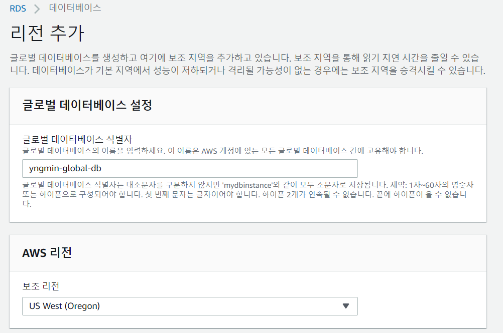 글로벌 데이터베이스 선택 > 작업 > 리전 추가