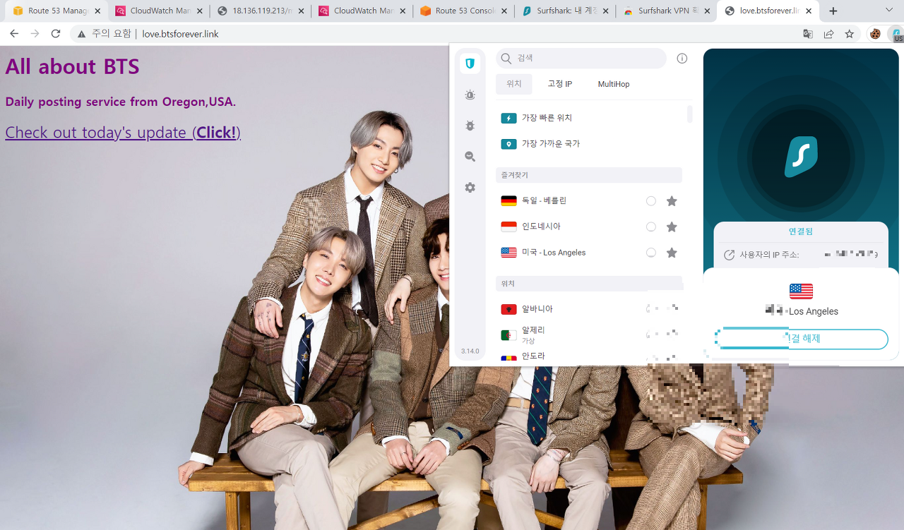 VPN으로 우회된 접속 국가에 따라 웹서비스의 호스팅 리전이 다르게 나타나는 것을 확인할 수 있다.