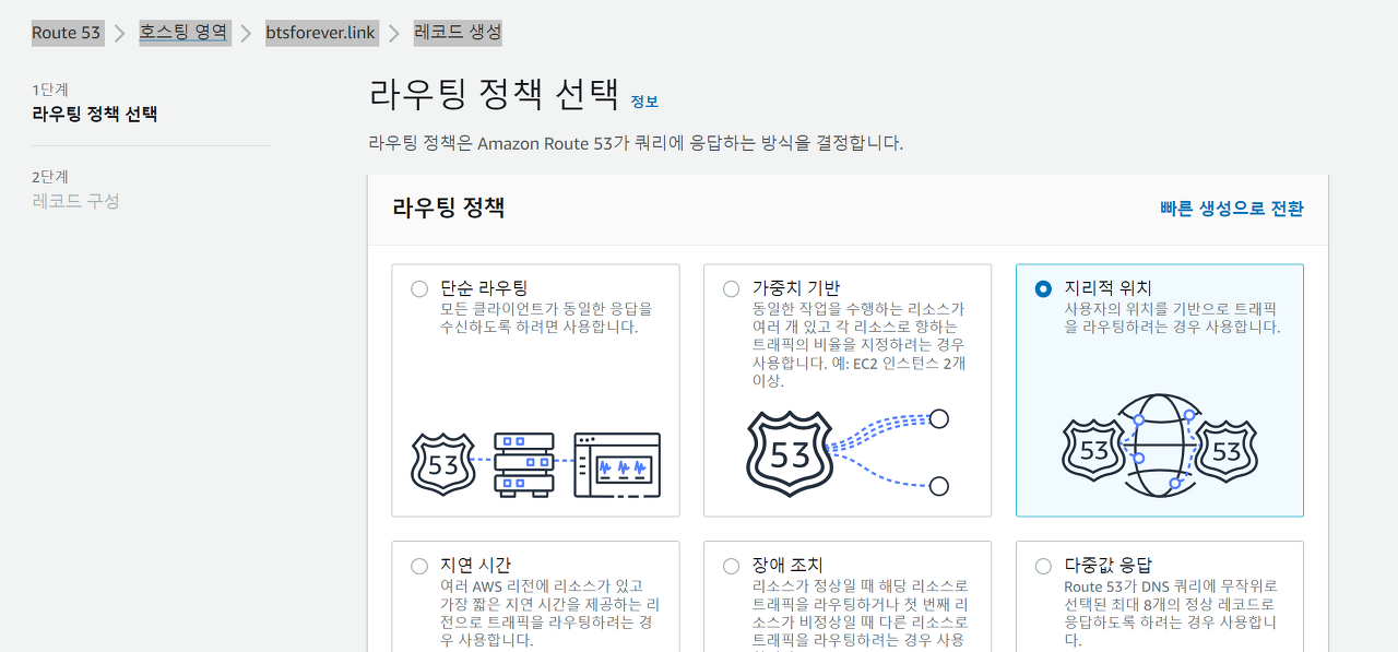 라우팅 설정에 앞서 도메인을 구입한다. Route53의 도메인 등록에서 손쉽게 진행할 수 있다. 그리고 라우팅 정책 중 사용자의 위치에 기반하여 미리 설정된 경로로 라우팅 하는 지리적 위치 기반 정책을 선택한다.