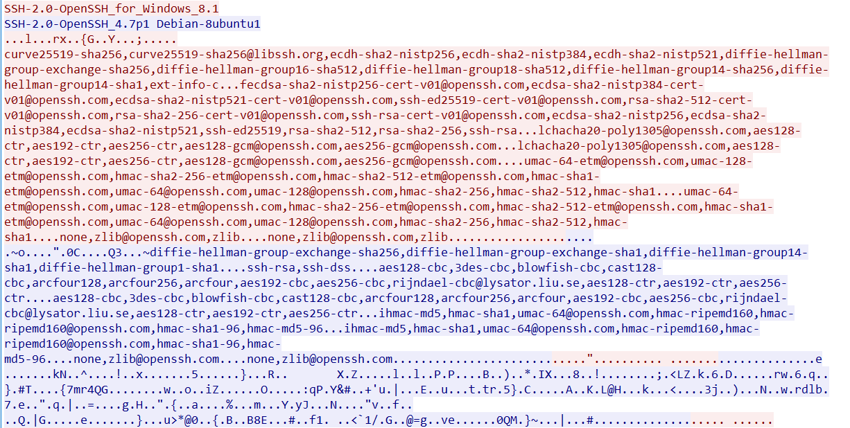 Follow > TCP내역을 확인하면, 처음엔 서로의 암호화키를 확인하고 교환하는 내용이 평문으로 적혀있다. (빨간색-Client, 파란색-Server) 틈틈히 Diffie-Helman, Sha256, RSA등의 암호화 방식들이 눈에 띈다.