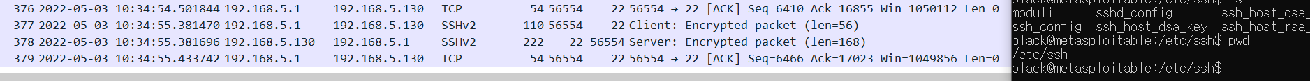 Metasploitable2 SSH접속, Wireshark로 패킷 캡쳐 스니핑 가능할지 확인하기