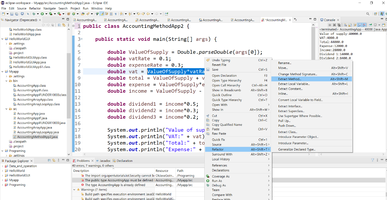 메소드 자동생성: 타겟 영역 우클릭 > Refactor > Extract Method