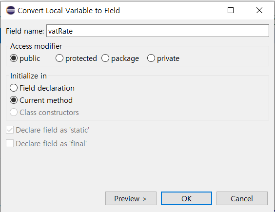 타겟 영역 우클릭 > Refactor > Convert Local Variable to Field..