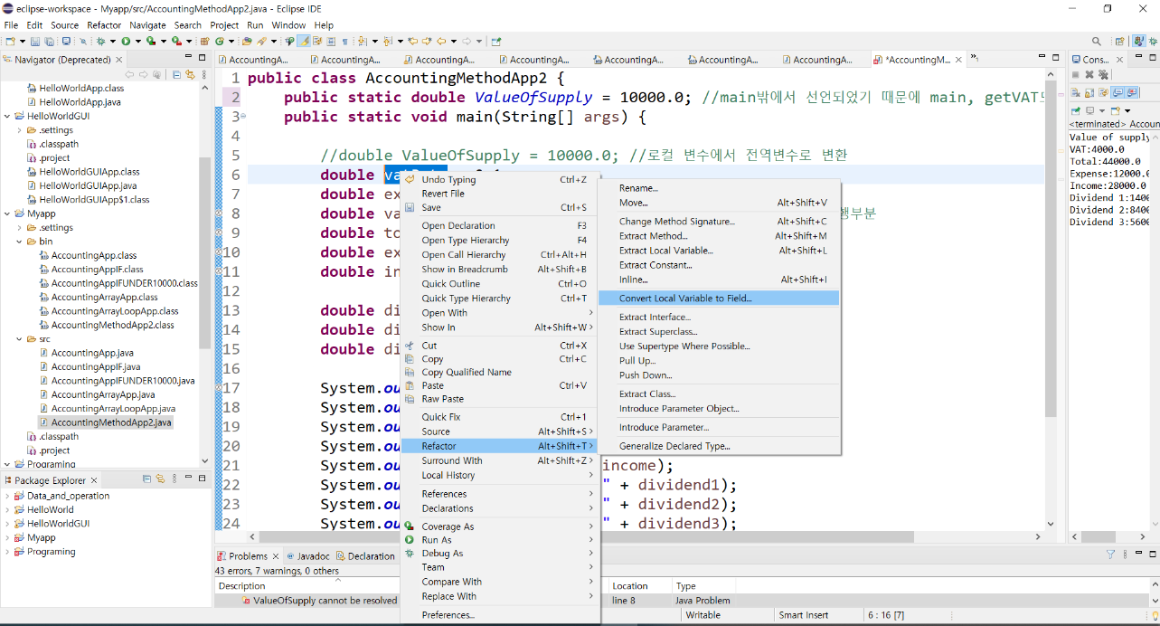 다만, main안에서 선언된 ValueOfSUpply는 로컬변수로 getVAT에서 적용이 어렵다. => 전역변수로 바꿔주기