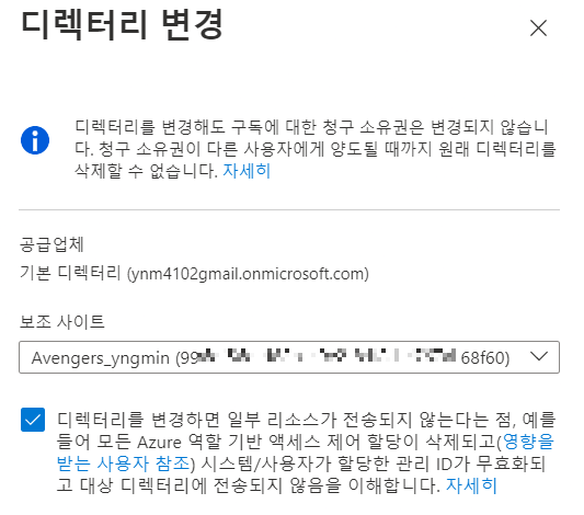 메인 검색 > 구독 선택 > 디렉터리 변경 > 새로 생성된 디렉터리(테넌트)로 변경