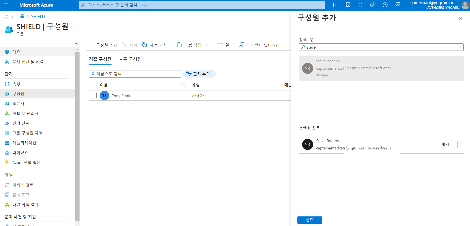 소유자로 등록된 Peter로 새로 Azure에 접속하여 사용자 계정을 멤버로 추가한다.
