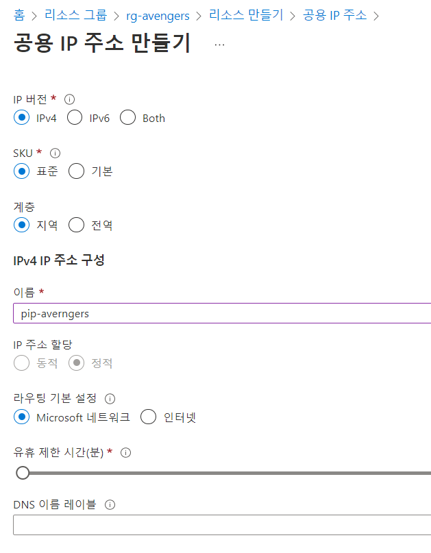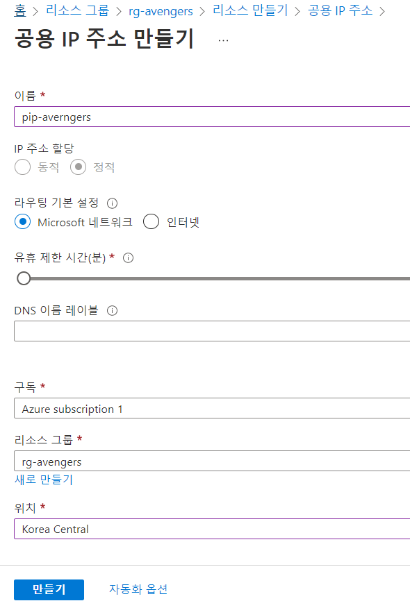 메인 페이지 > 리소스 만들기 > 공용 IP주소 검색 > 만들기