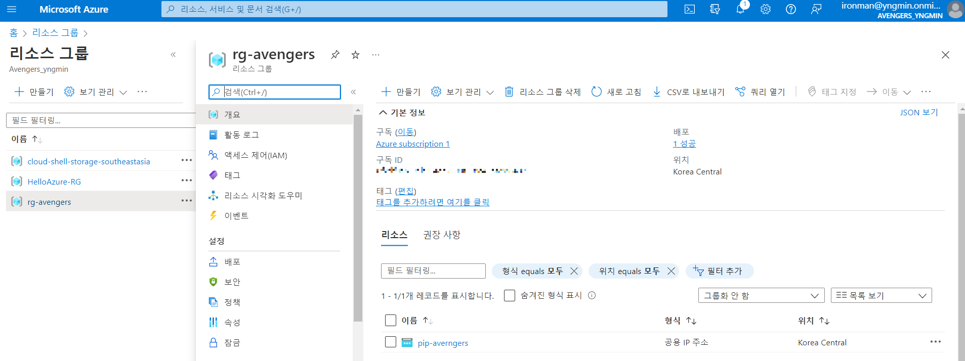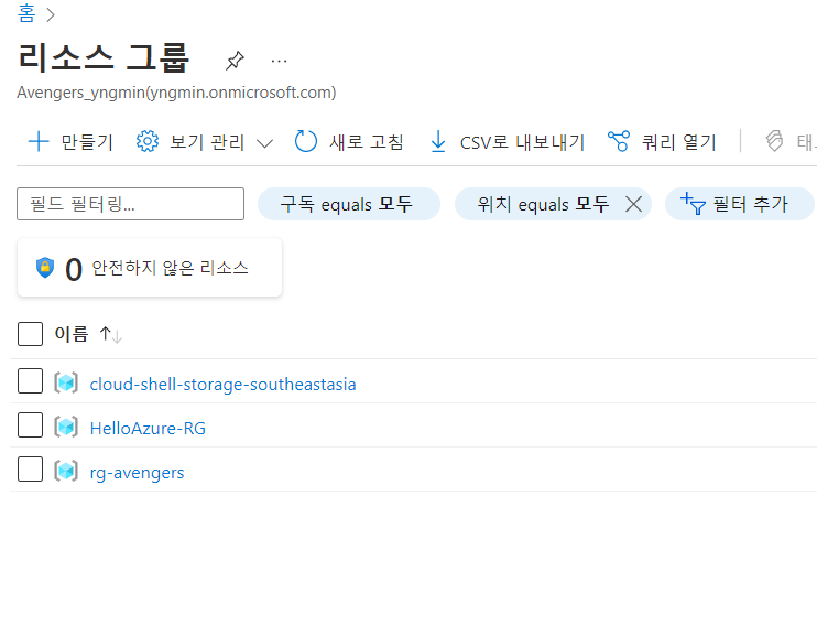 현재 로그인 중인 Steve Rogers계정을 사용하여 새로운 리소스 그룹을 생성한다. Tonny Stark에게 새로운 리소스 그룹에 대해 '기여자' 역할을 할당하고, 다시 Tony로 로그인하여 해당 리소스 그룹을 확인한다.