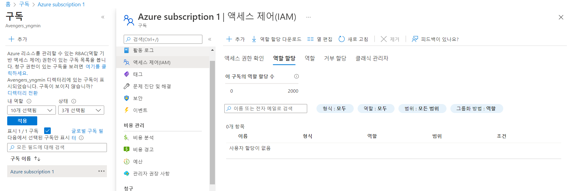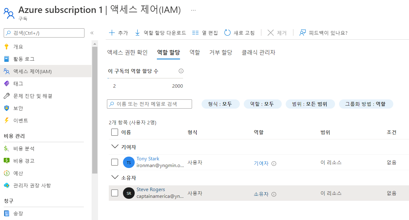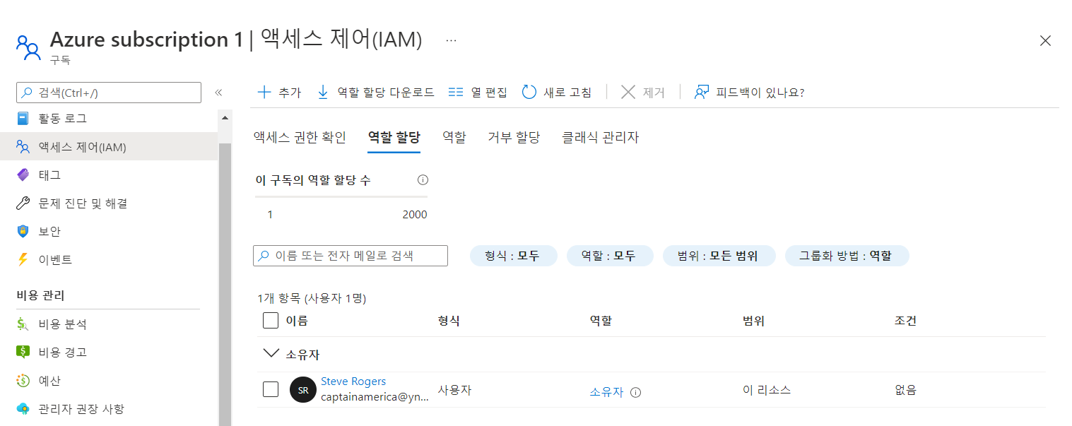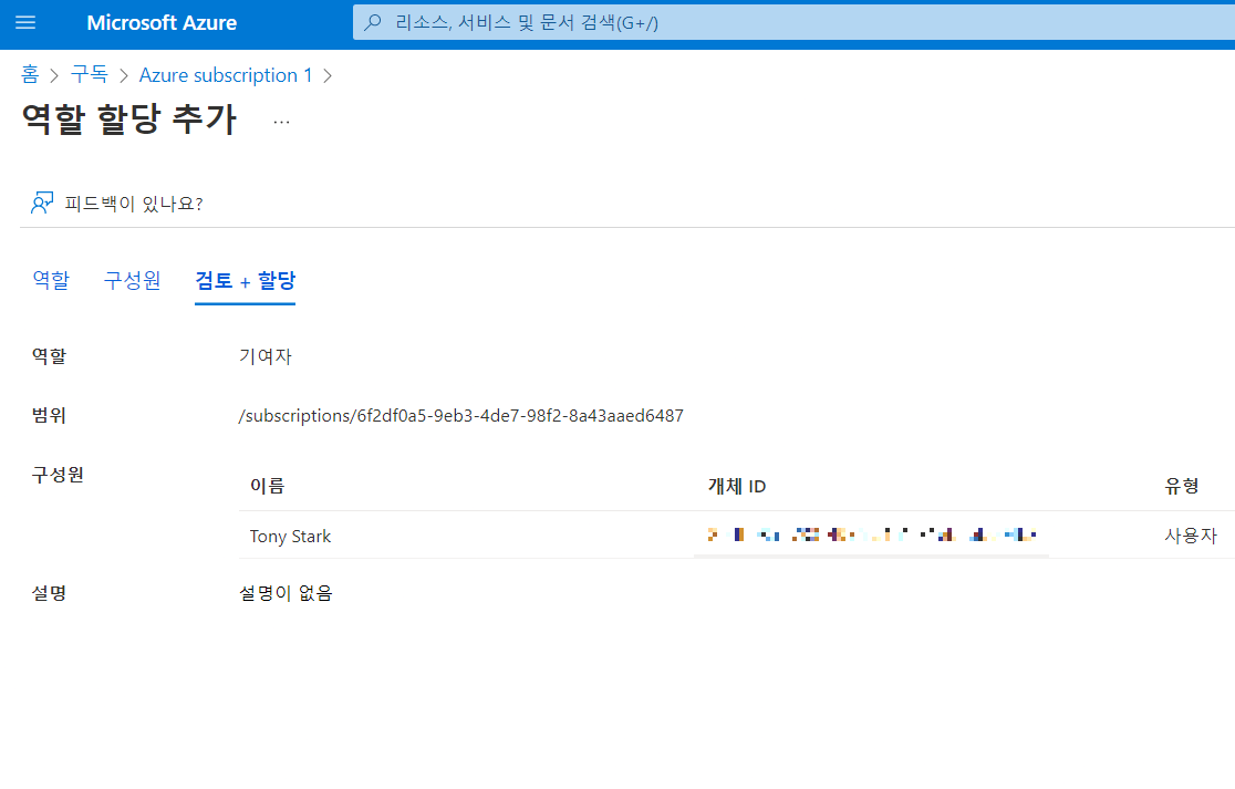 메인 > 구독 > 엑세스 제어(IAM) > 역할 할당 추가