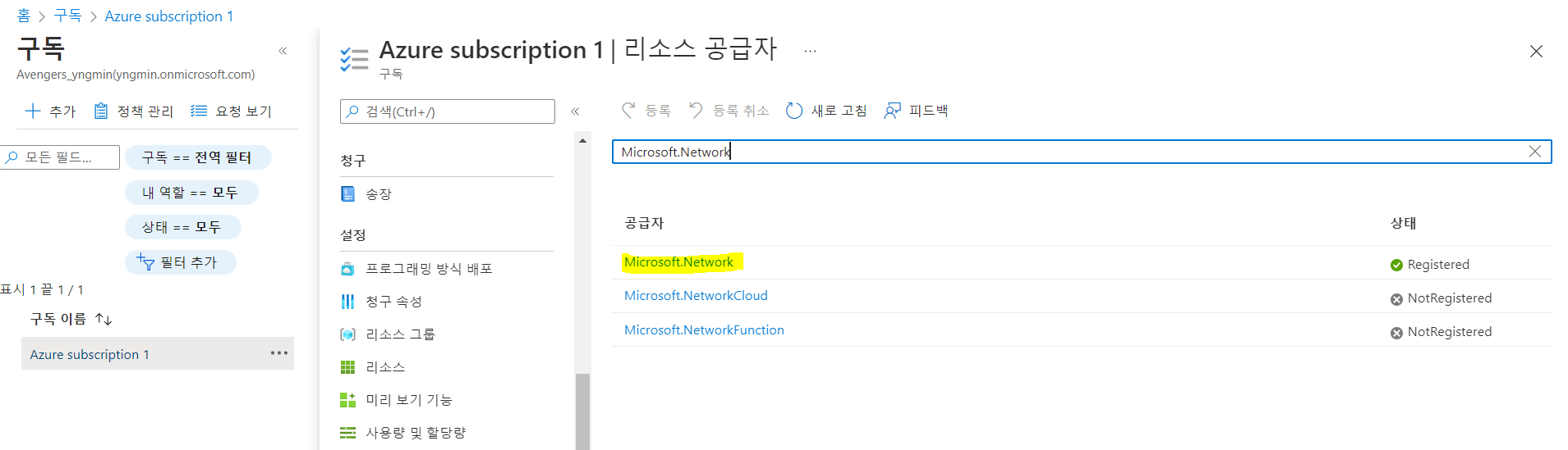 구독 > 리소스 공급자 > 공급자 'Microsoft.Network' 선택