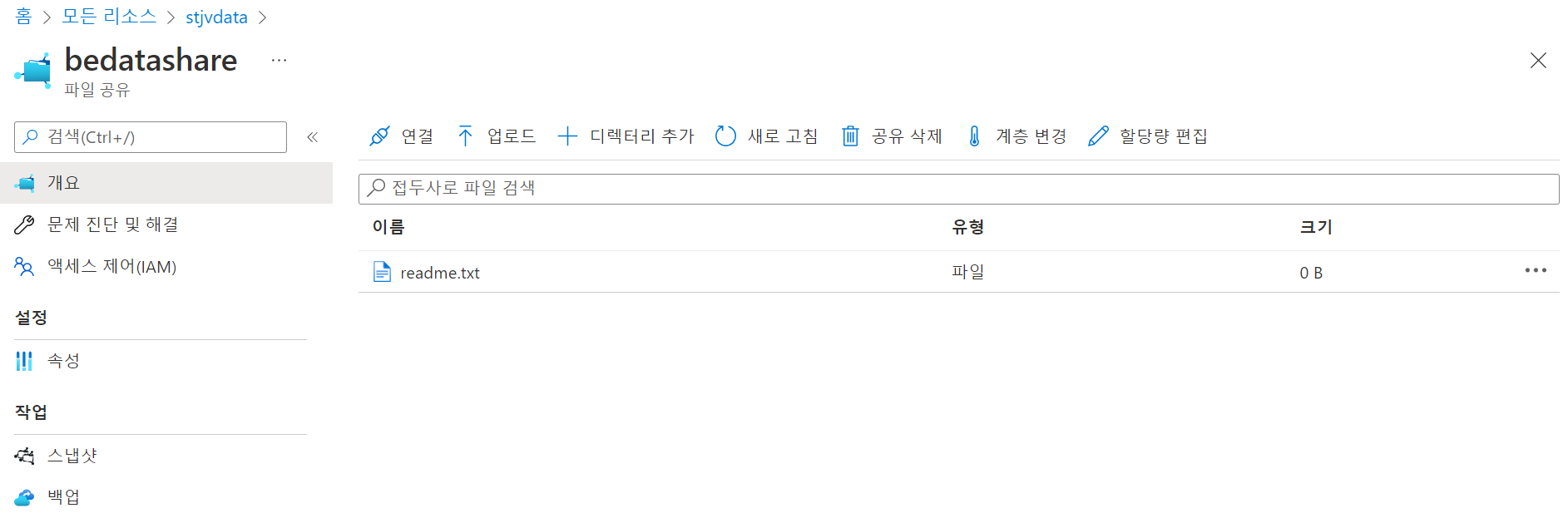 리소스 > 스토리지 계정 > 데이터 스토리지 > 파일 공유 선택