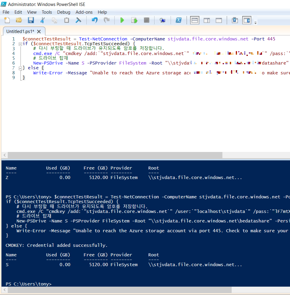 Power Shall에 스크립트 붙여 넣기 > 전체선택 후 F8로 실행 > 드라이브 Z 연결 확인