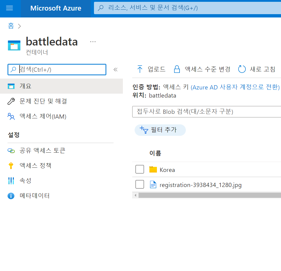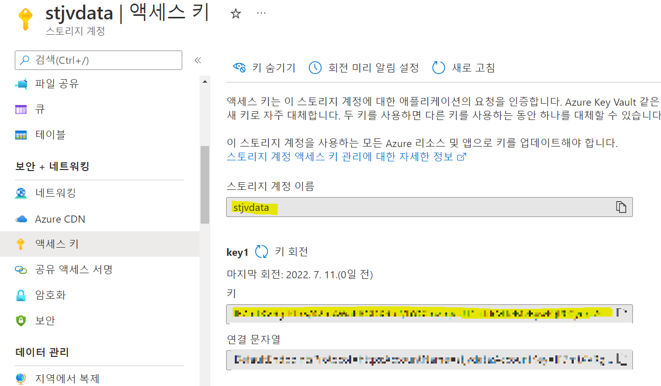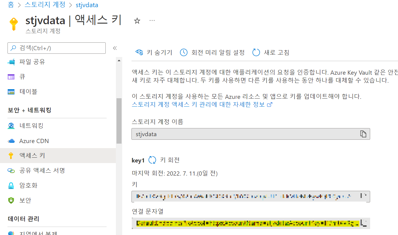 스토리지 계정 > 보안+네트워킹 블레이드 > 액세스 키 선택