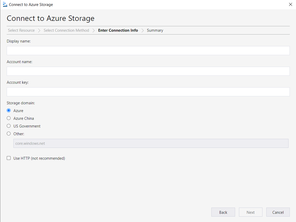 플러그 모양 선택 > Sorage account or servie > Account name and key 선택