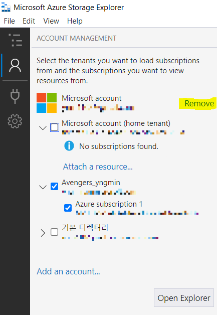 Select Resource(팝업) > Subscription 선택 > Azure선택 > 구독 중인 Azure 계정 입력 > Open Explorer 클릭