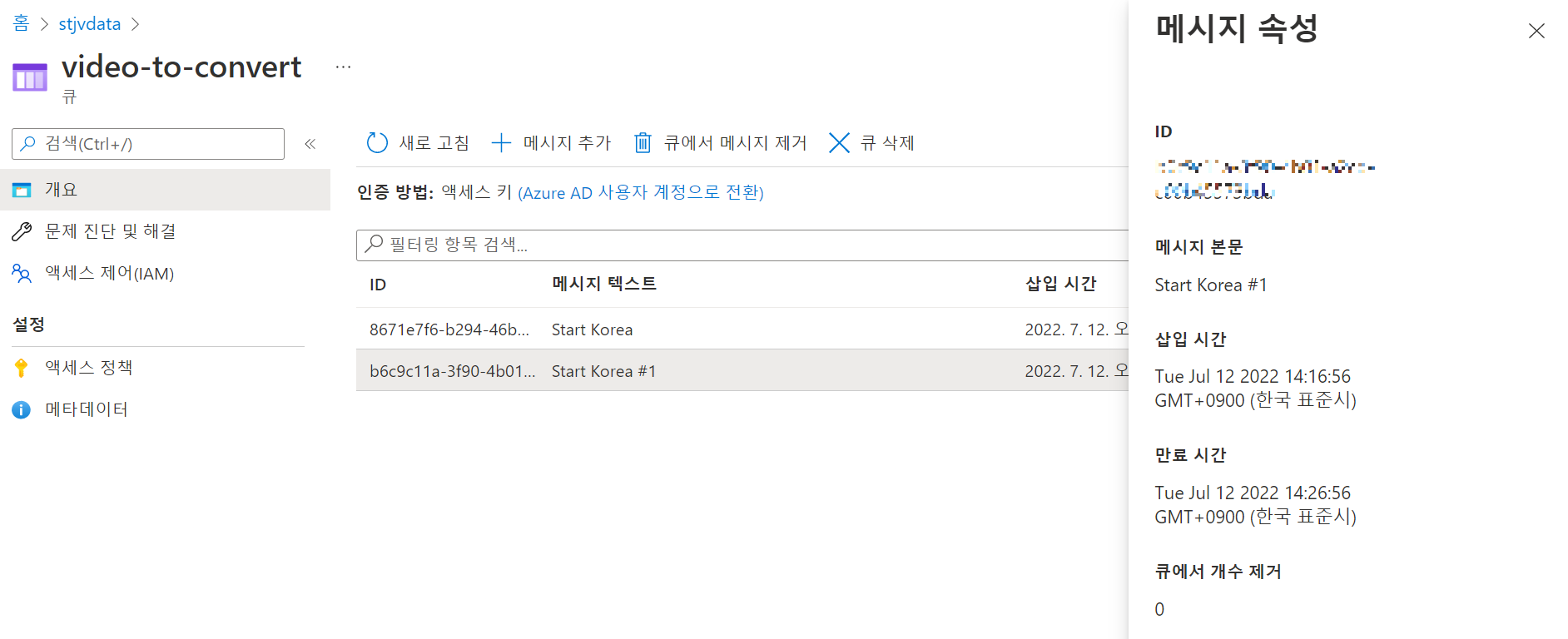 - 스토리지 계정 이름 및 키 확인