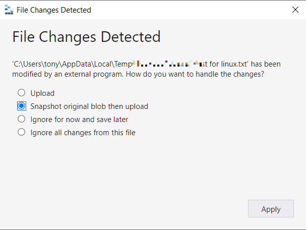 파일내용 변경 감지 시 원본 보존을 원한다면 'Snapshot original blob then upload' 선택