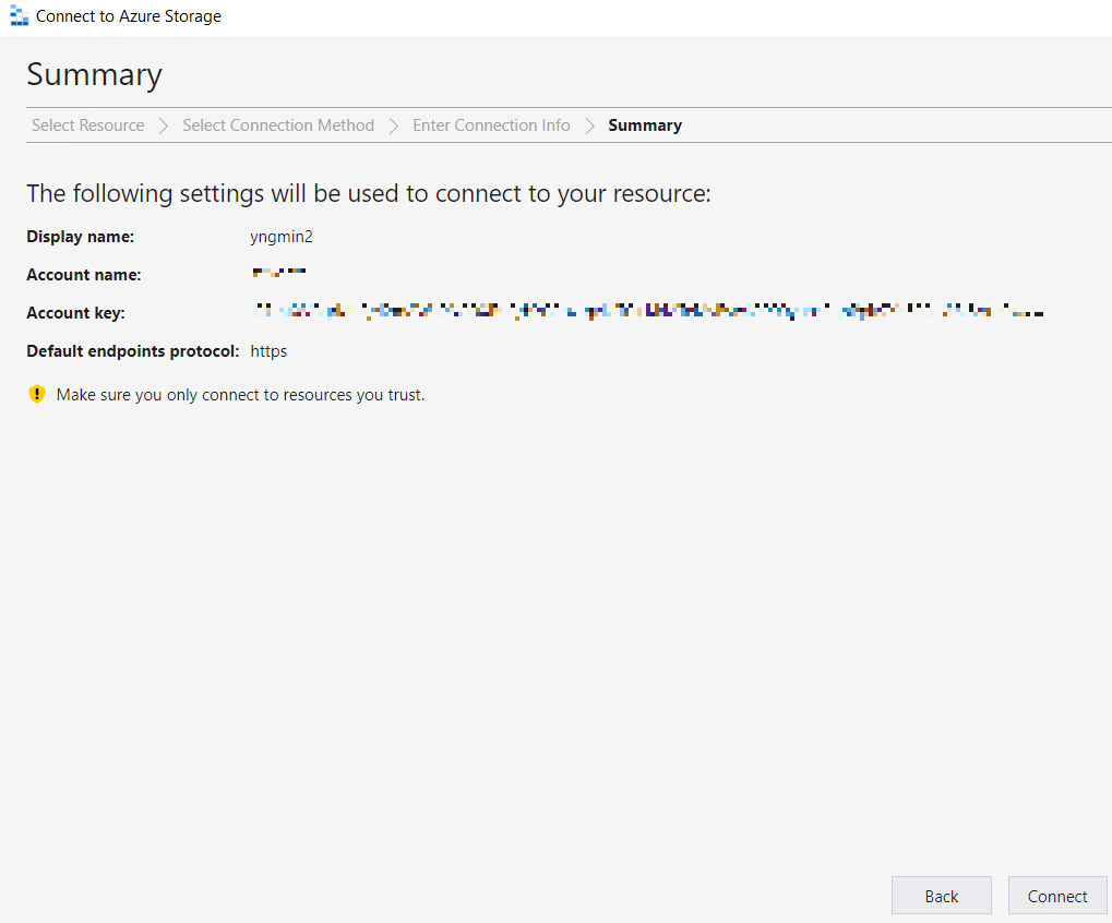 Display name은 자율적으로 지정, 스토리지 계정의 '연결 문자열'을 복사해 Connection string에 붙여 넣는다.