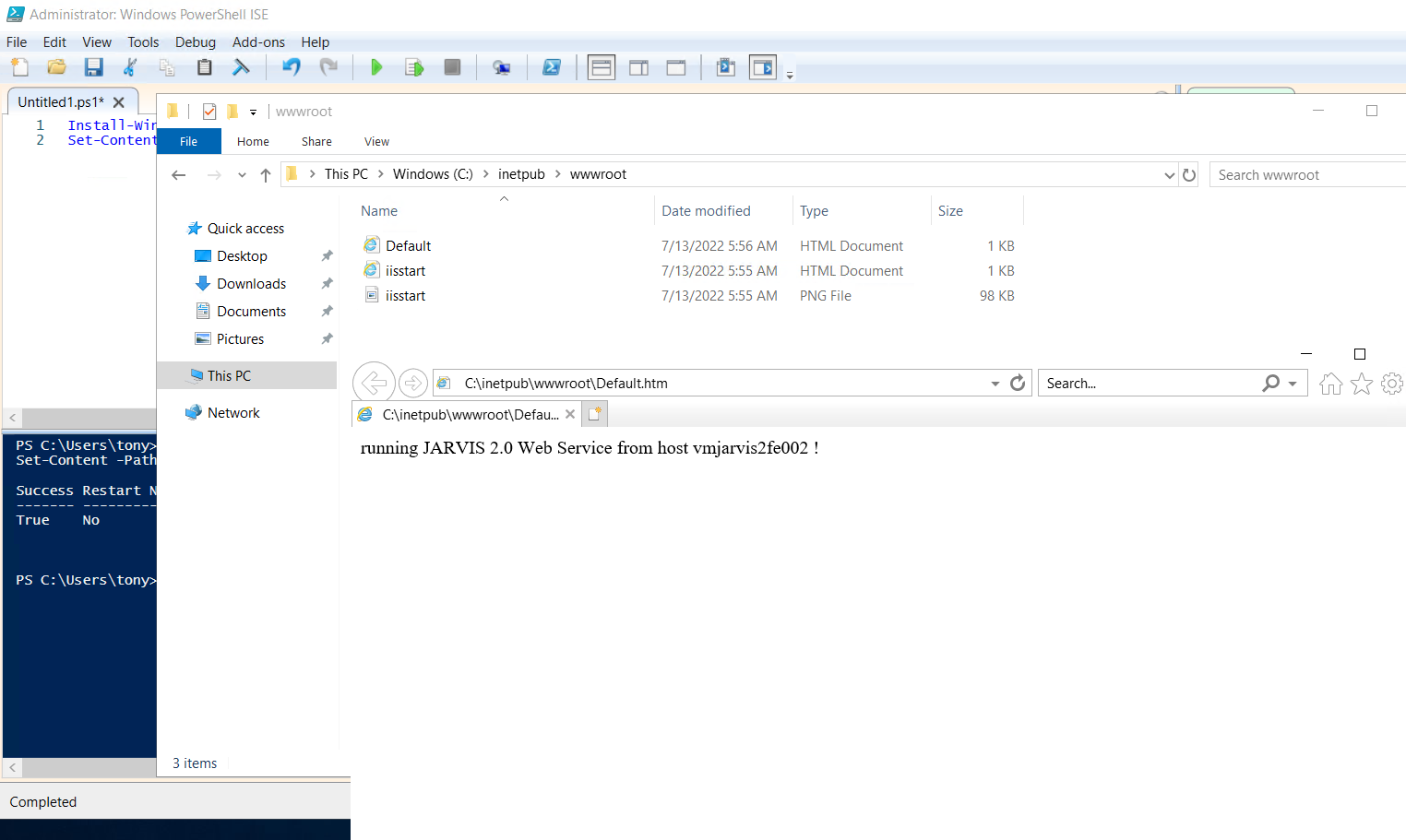 Set-Content -Path "C:\inetpub\wwwroot\Default.htm" -Value "running JARVIS 2.0 Web Service from host $($env:COMPUTERNAME) !"