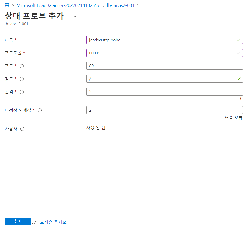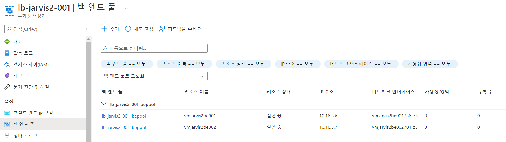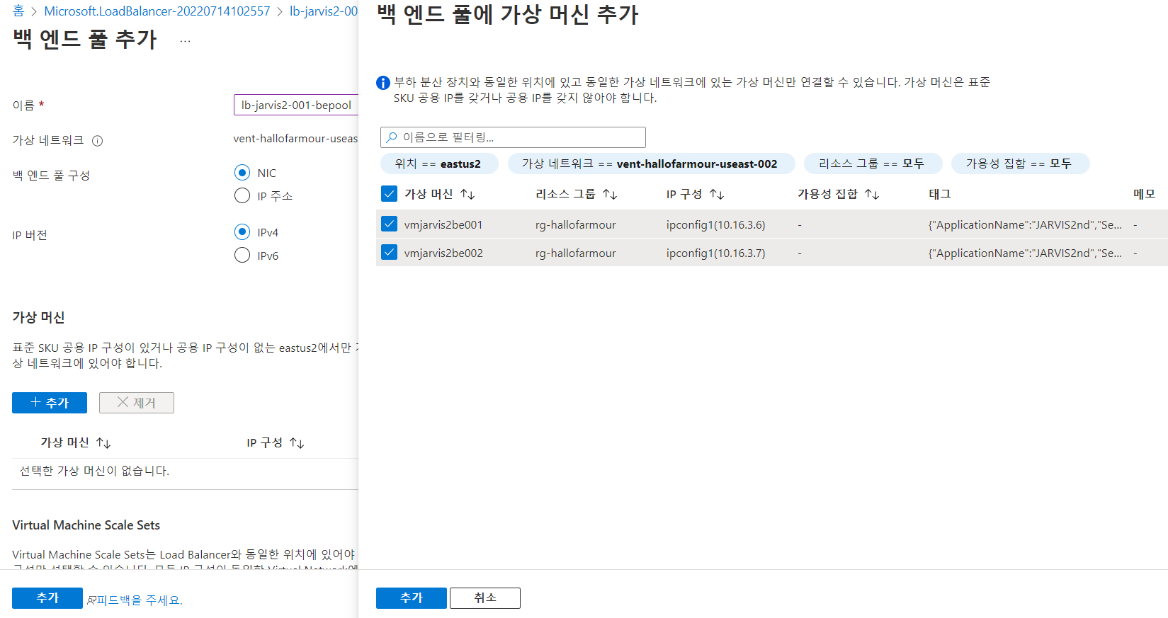 가상 머신 + 추가 > 백 엔드풀 대상인 우분투 서버(2개) 선택