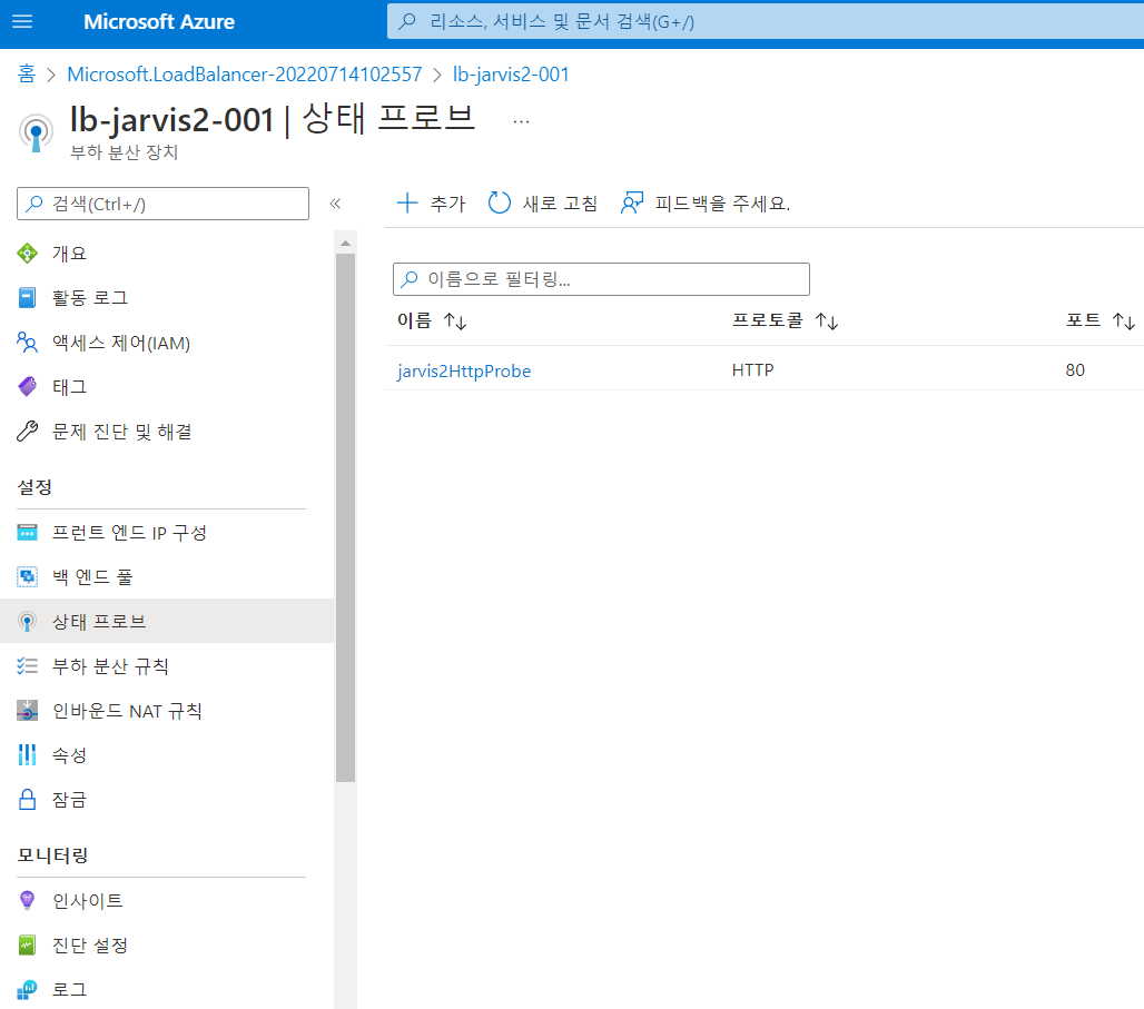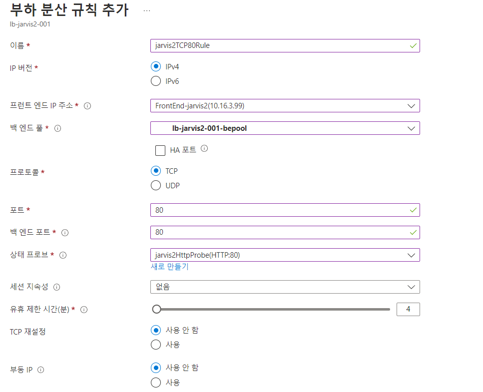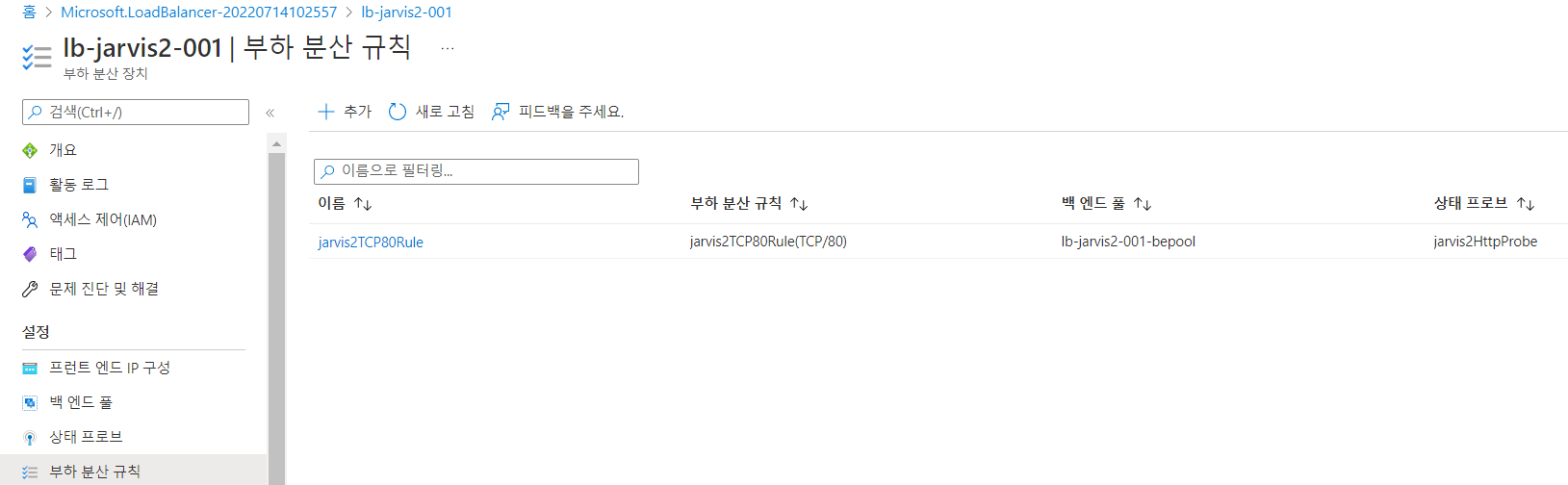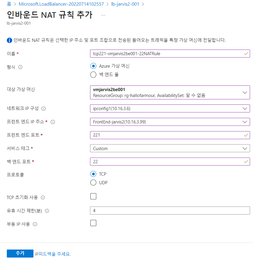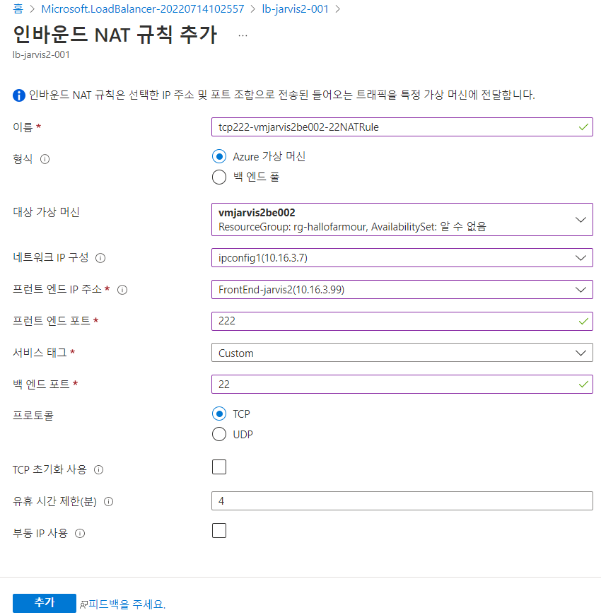 부하 분산장치 > 설정 블레이드의 '인바운드 NAT 규칙 설정' 선택 > 추가