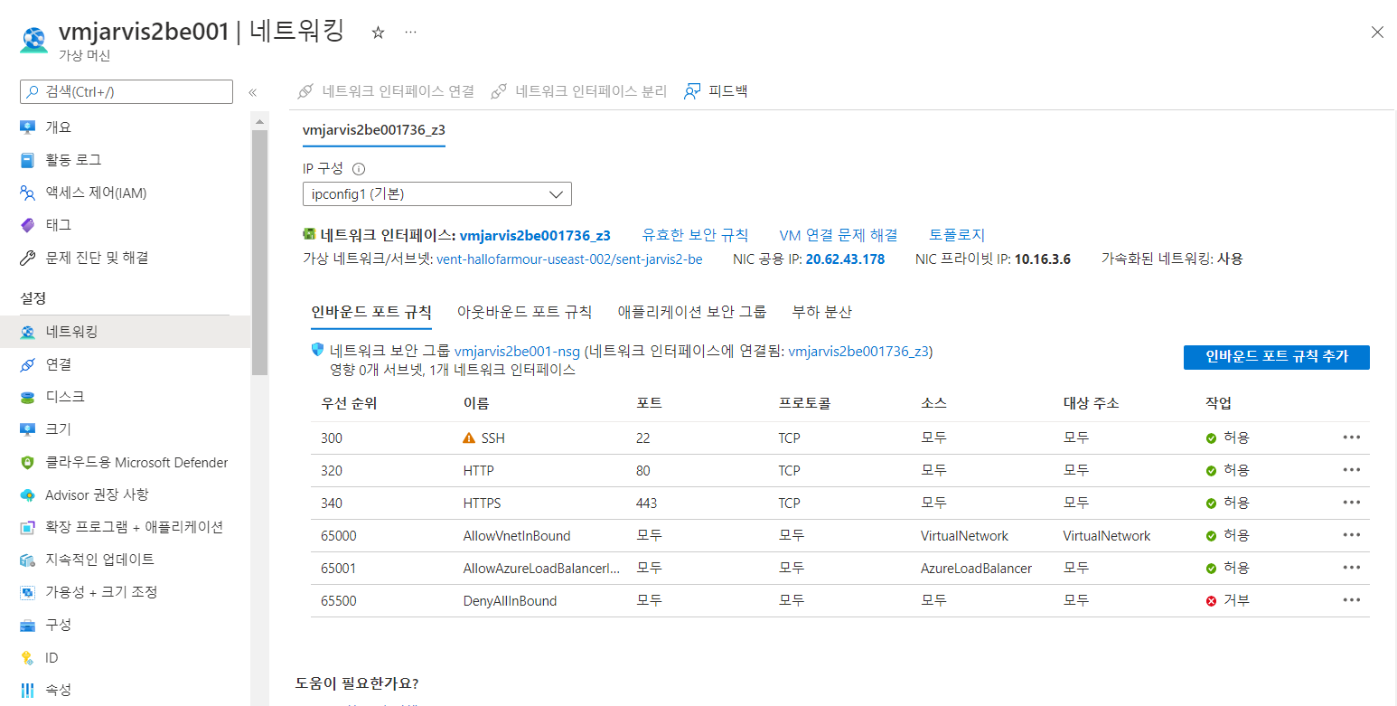 해당 VM > 네트워킹 > 인바운드 포트 규칙 추가