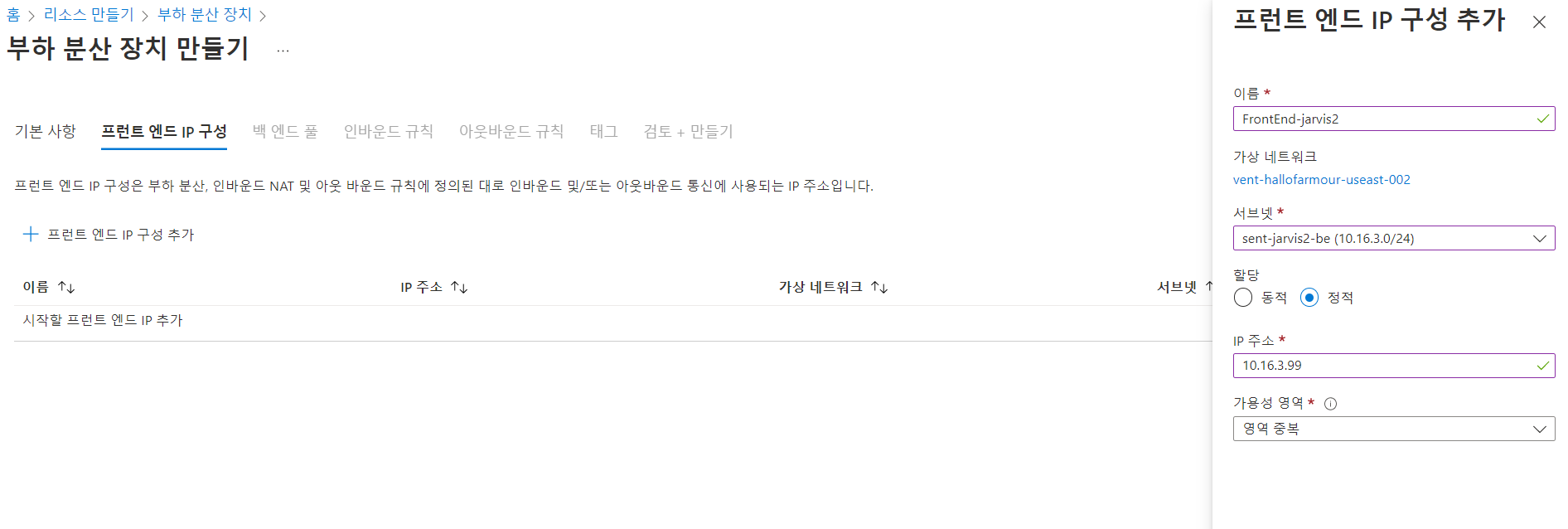 프런트 엔드 IP 구성 클릭 후 내용 기입 > 추가