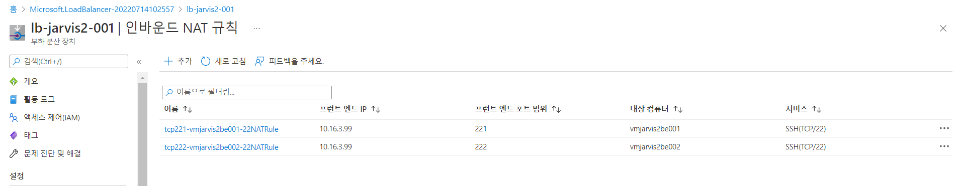 : 백엔드로 사용될 두 개의 우분투 VM에 대해 각각 인바운드 *NAT 규칙을 설정해준다.