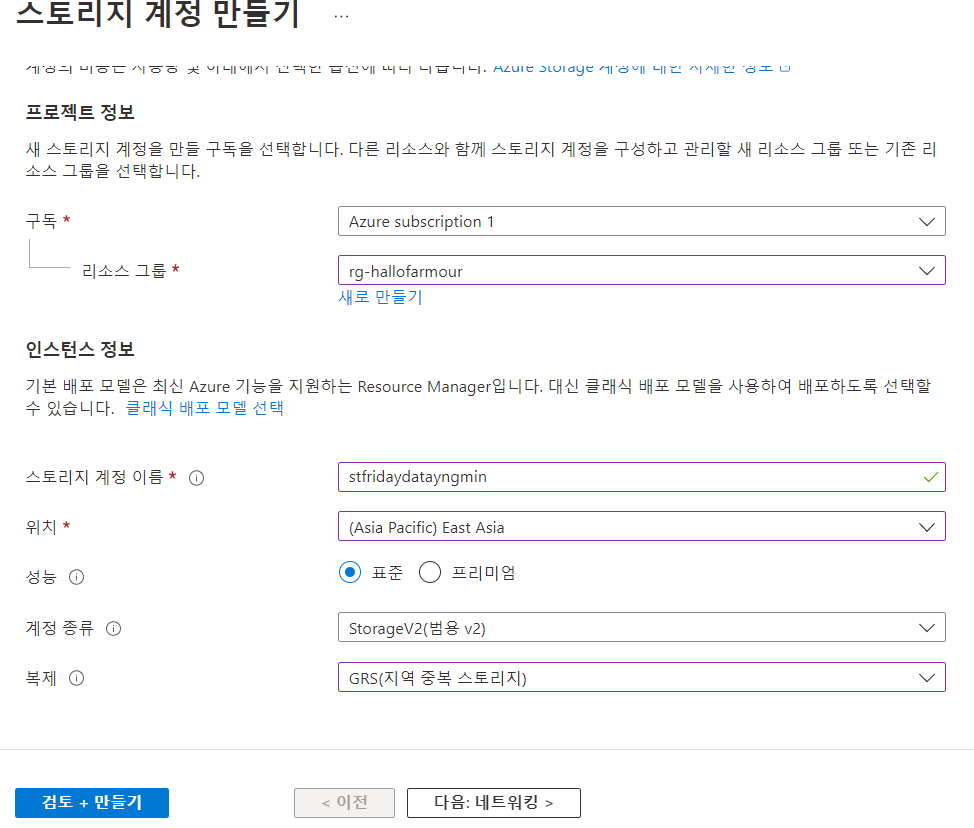레거시 스토리지 계정 유형을 만들 수 있는 화면을 전환해 내용을 입력한다.
