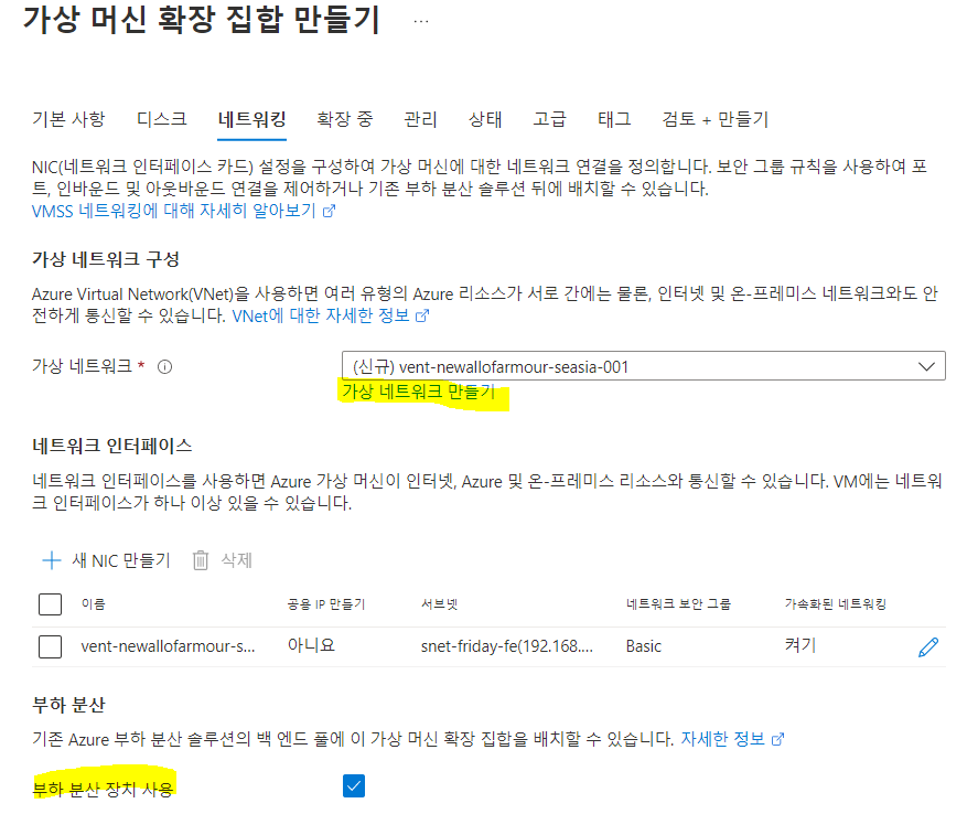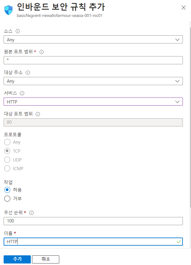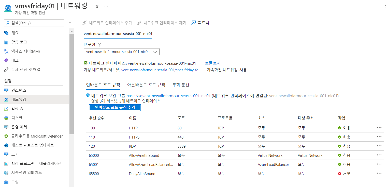메인 > VMSS > 해당 리소스 선택 > 네트워킹 > 인바운드 포트 규칙 추가 선택 (아래 3개 규칙 추가)