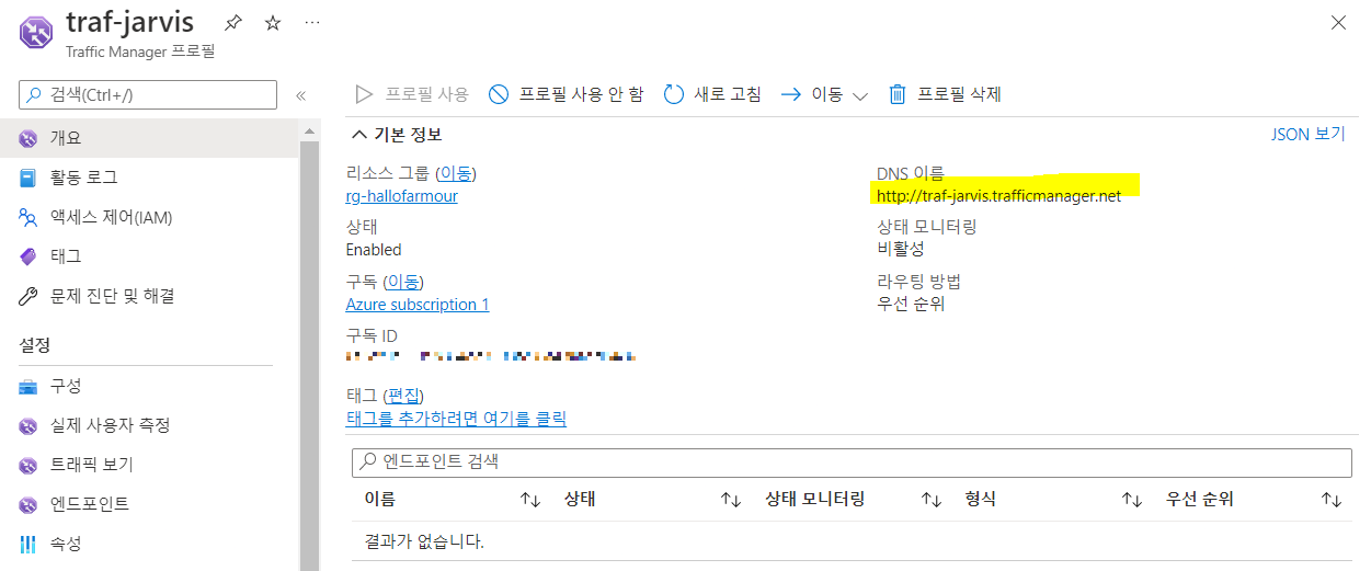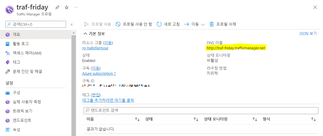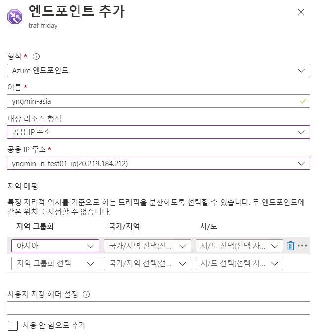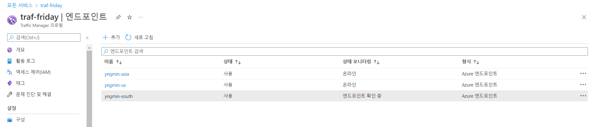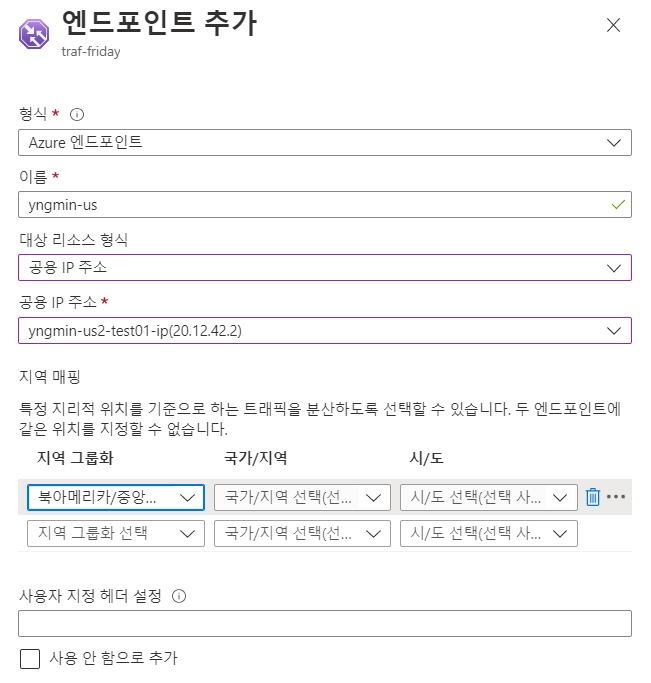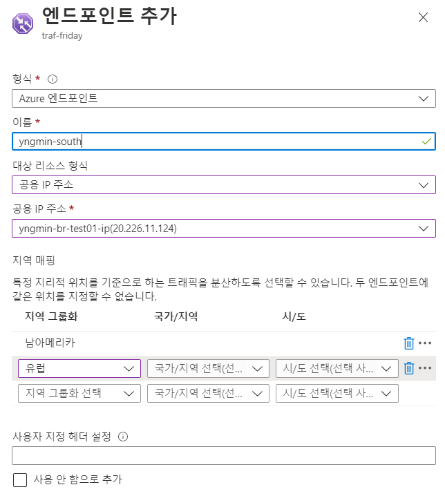 Trafic Manager > traf-friday 엔드포인트 블레이드 > 엔드포인트 추가 (지역별로 배정)