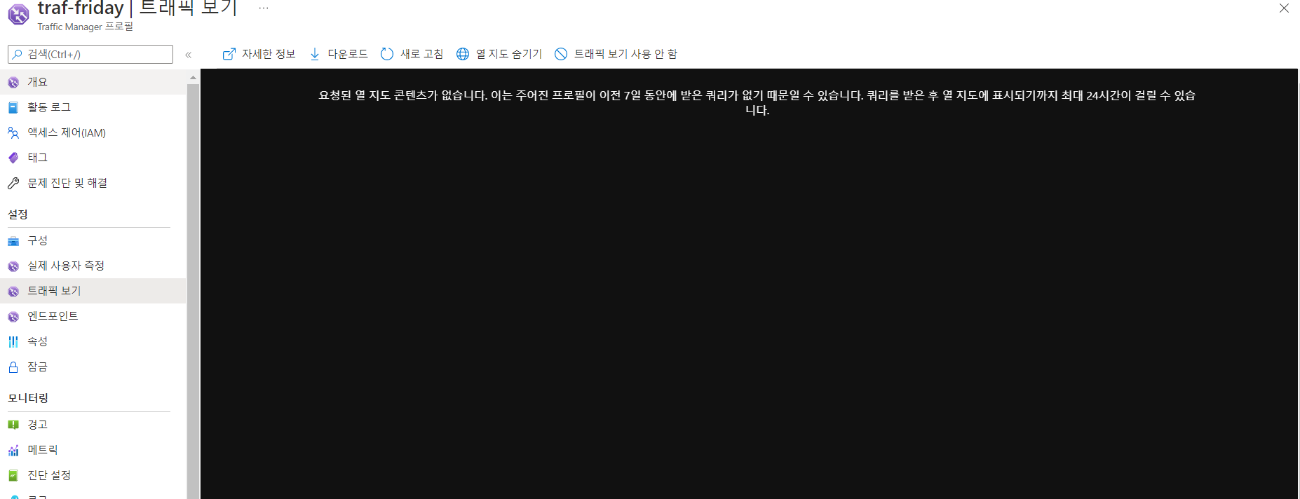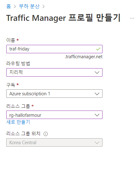 같은 방법으로 friday에 대한 Traffic Manager 프로필을 생성한다. 라우팅 방법은 '지리적'으로 선택한다.