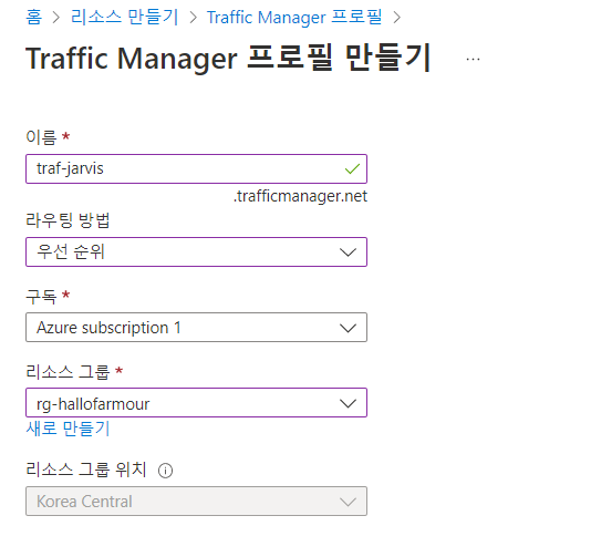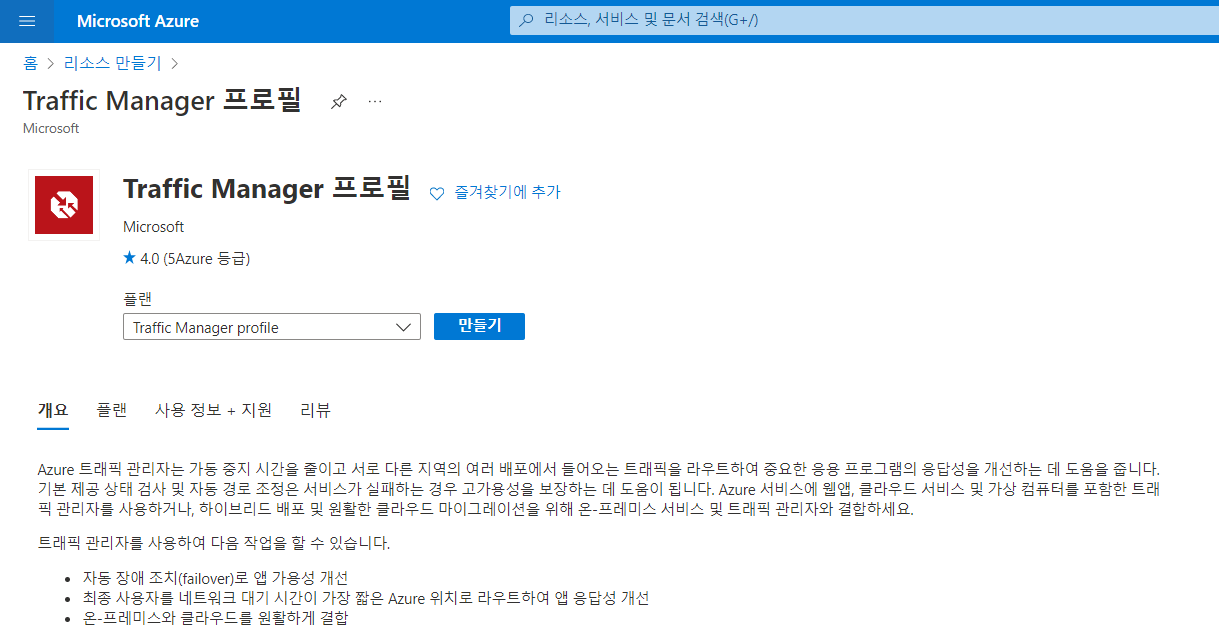 리소스 만들기 > Traffic Manager 프로필 > 만들기