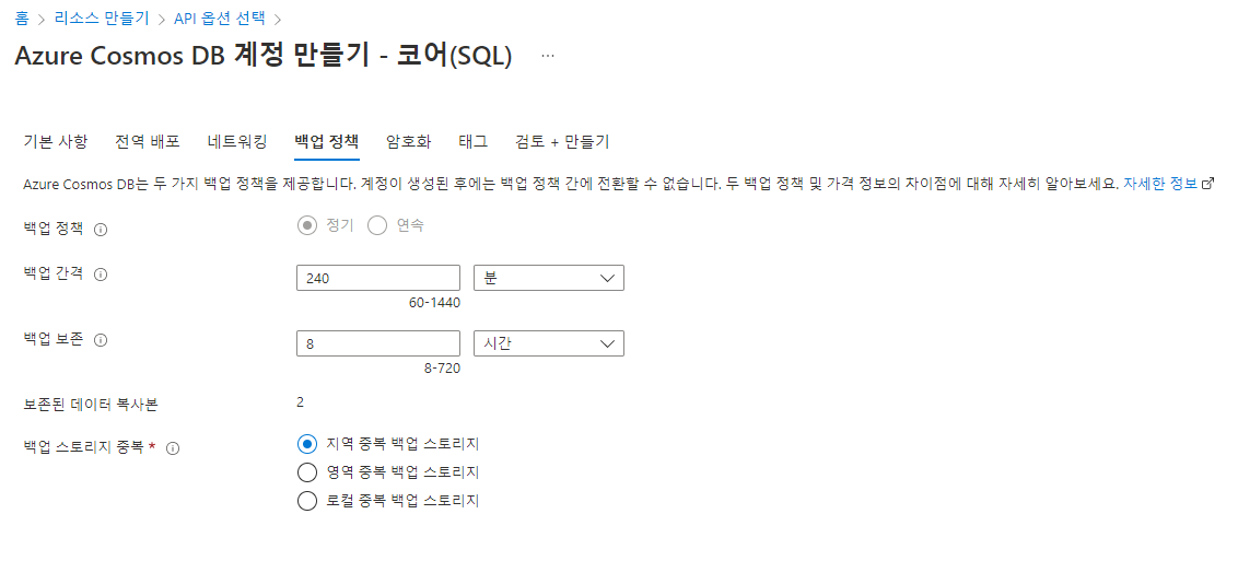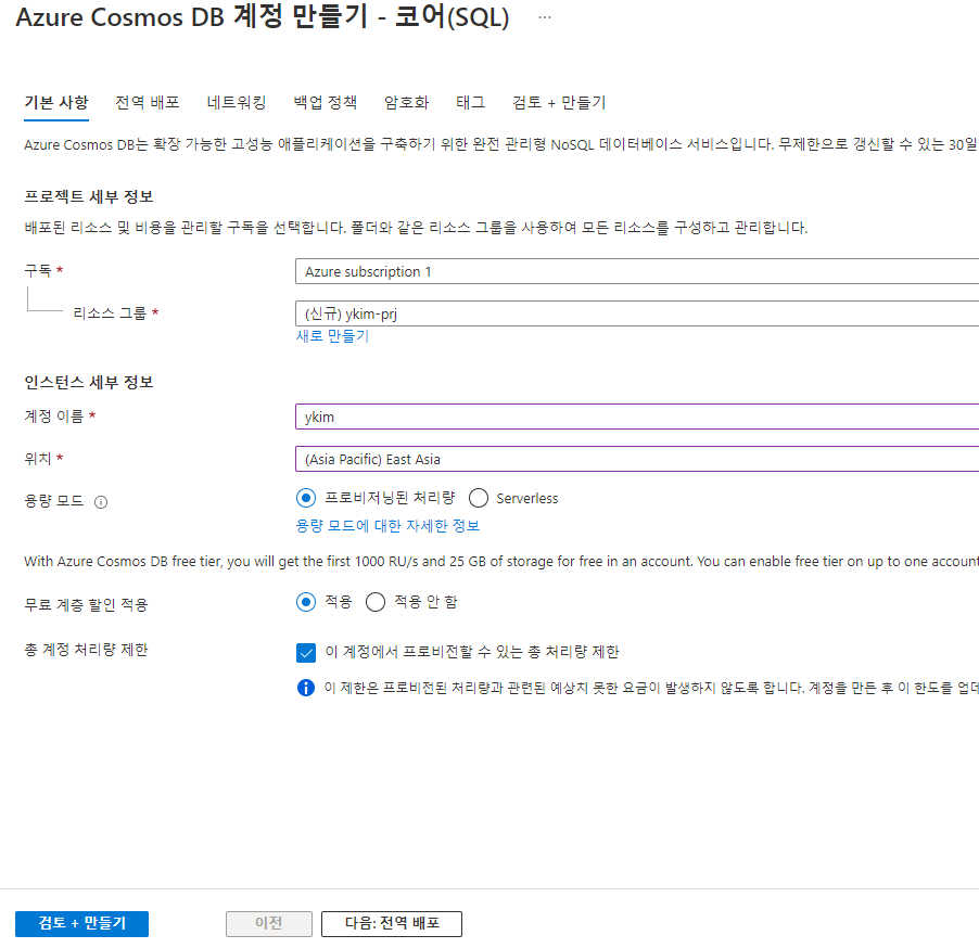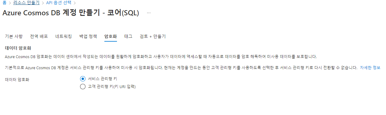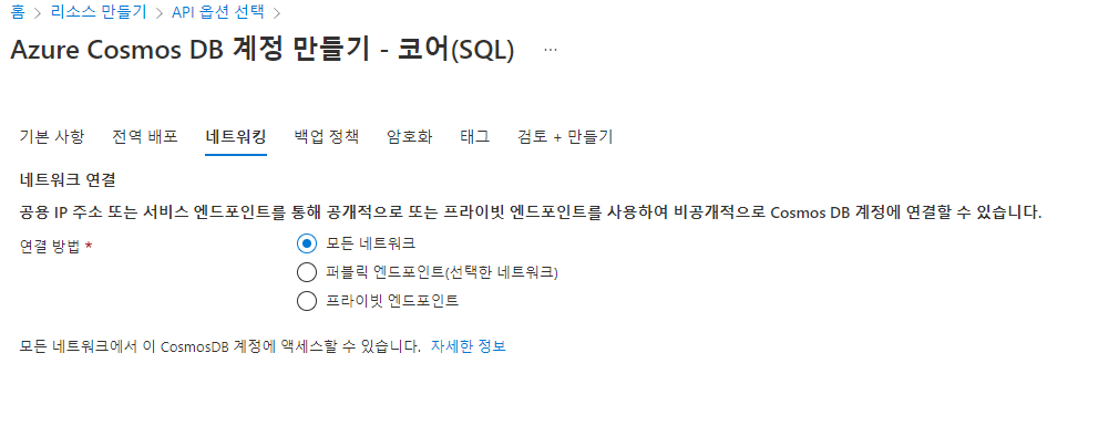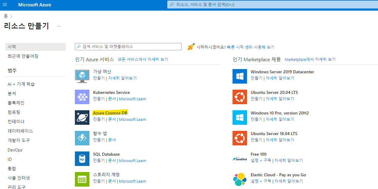 메인 > 리소스 만들기 > Azure Cosmos DB 만들기 > 코어(SQL) 선택