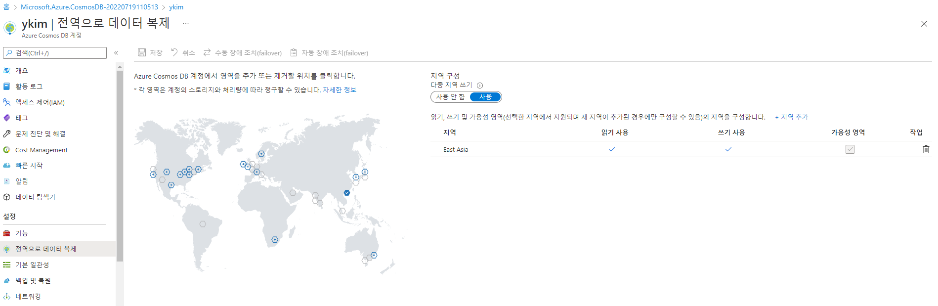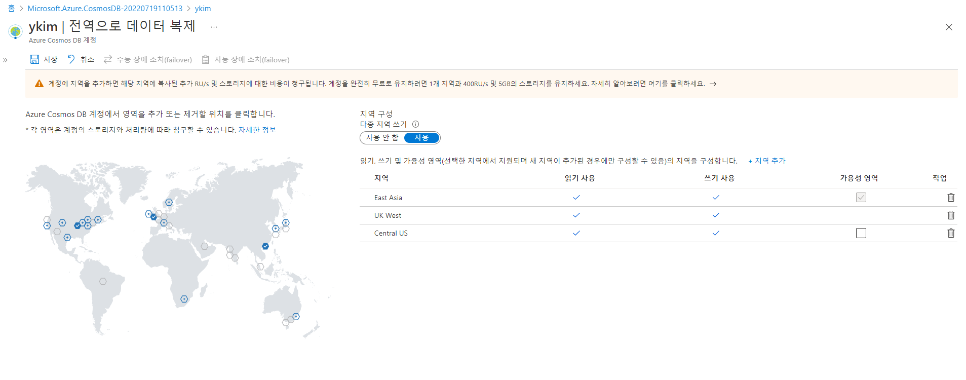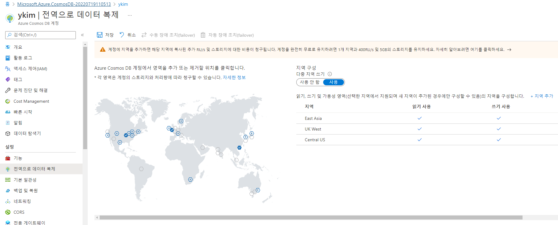 Cosmo DB리소스 > 설정 블레이드 > 전역으로 데이터 복제 선택