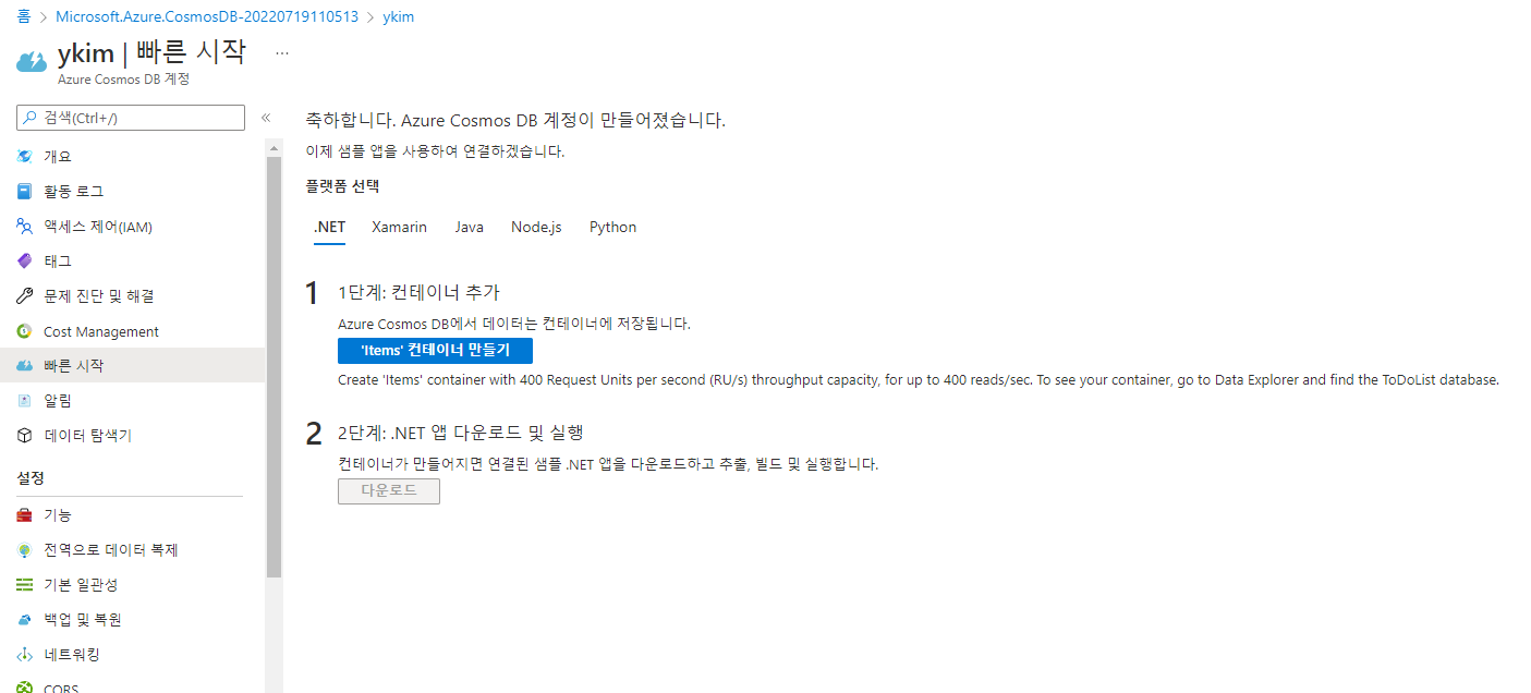 [Azure] 처음 만나는 Azure (17) - 코스모스DB 만들기 본문