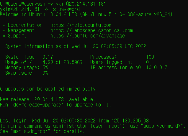 ssh -y username@ipaddr / 비밀번호 입력