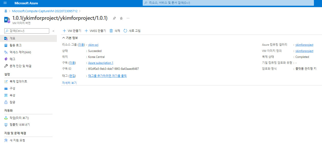 2) 지역별 VM생성 : 리전간 이미지 복사를 위해 '갤러리'기능을 활성화하면 기존 VM은 일반화되어 구동이 중지된다.