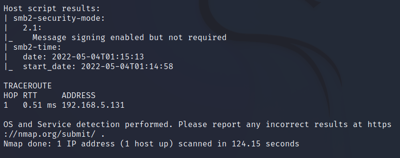 $sudo nmap -A 192.168.5.131 => smb취약점에 대해 많이 말해준다.
