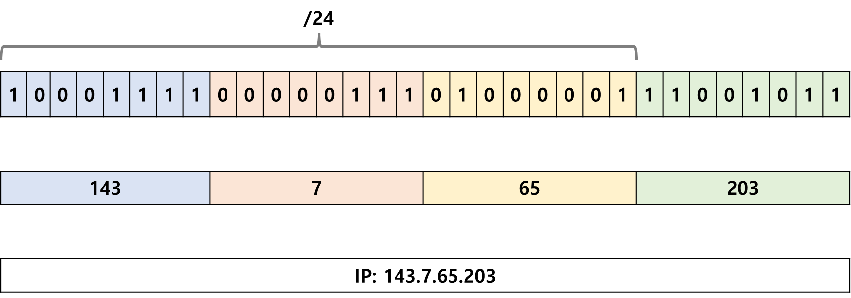 비트 단위로 0~32까지 표현하는 표기법을 말한다. 우선, IPv4주소 체계의 경우 아래와 같이 4개의 옥텟(8비트)으로 이루어져 있으며 CIDR이 "/24"로 표기 된 경우 앞자리 부터 24비트 이후의 4번째 옥텟(초록색)은 모두 사용 가능하다는 의미이다.