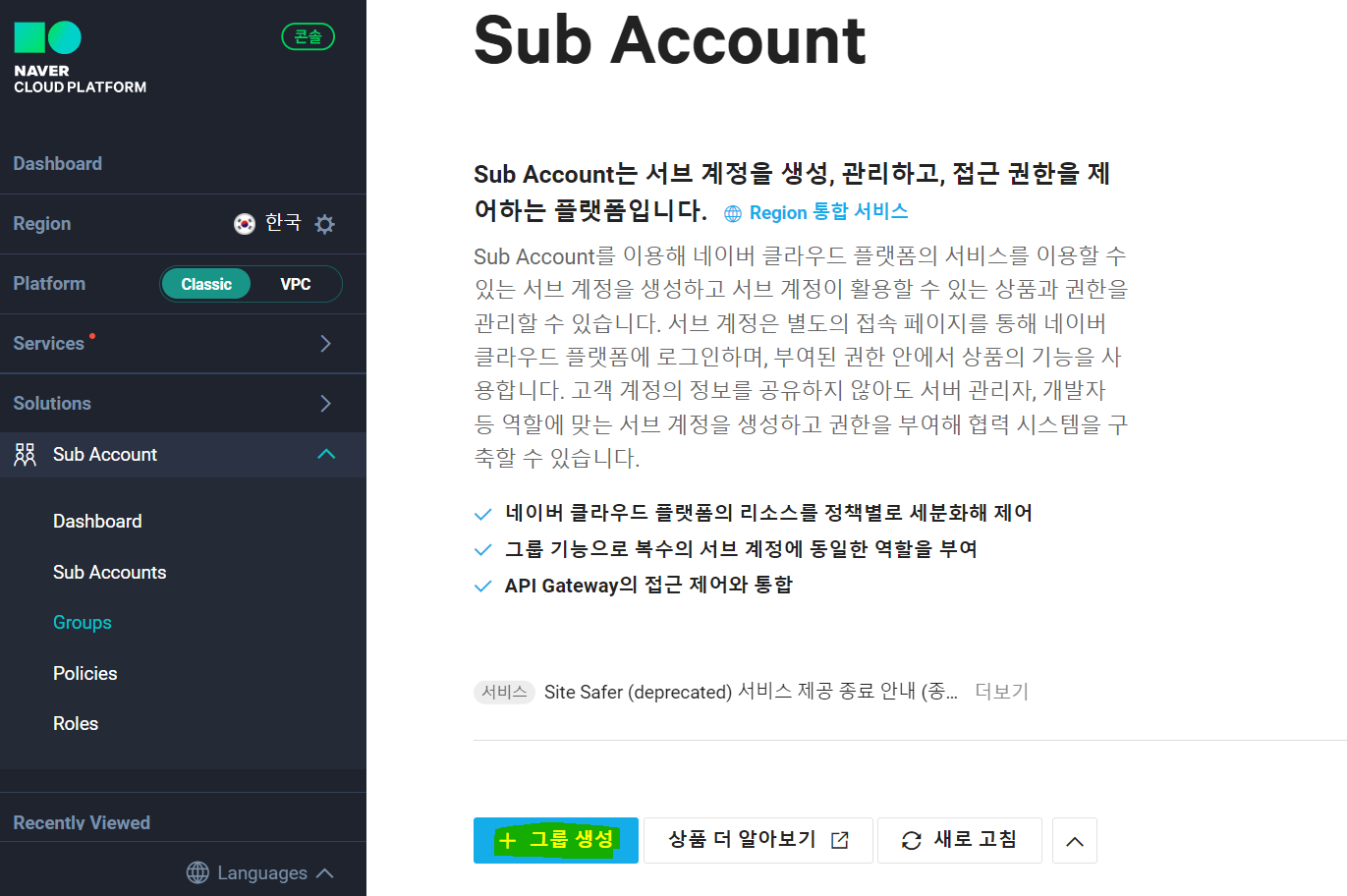 Sub Account 탭 > Groups > '그룹생성' 선택